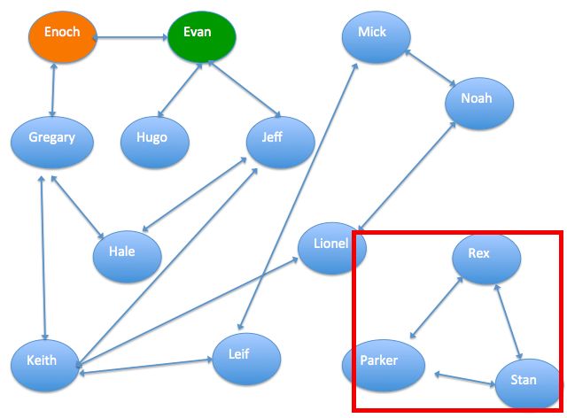 下图是已知的一份人物通联关系图,每两个人之间的连线表示两人有一定关系,可以是同事或者亲人关系等。已知“Enoch”是信用用户,“Evan”是欺诈用户。需要通过图算法,计算出其它人的信用指数,即得到图中每个人是欺诈用户的概率。这个数据可以方便相关机构做风控。
