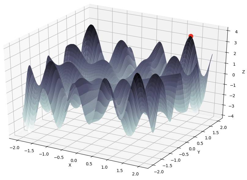 下面我们使用GAFT内置算子来搜索同样具有多个极值点的二元函数f(x)=ysin(2πx)+xcos(2πy) 的最大值,x, y 的范围为 [−2,2] .