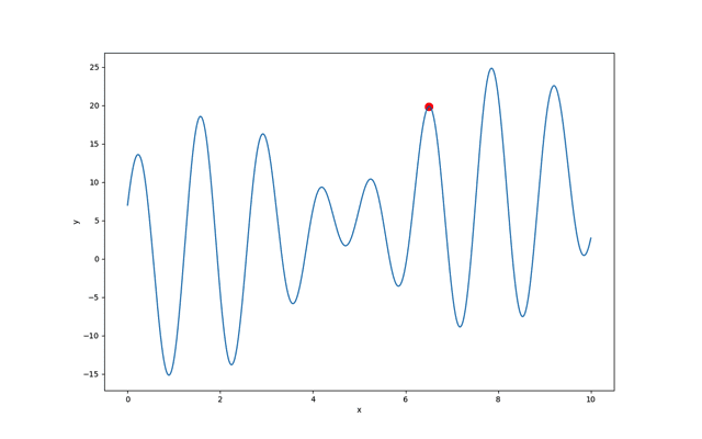 首先我们先对一个简单的具有多个局部极值的函数进行优化,我们来使用内置的算子求函数 f(x)=x+10sin(5x)+7cos(4x)的极大值,x的取值范围为[0,10]