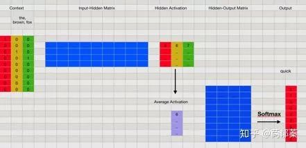 举个简单的例子:词表大小为9的一段文本序列one-hot,乘以一个参数矩阵(蓝色部分),做均值pooling,乘以一个参数矩阵然后经过softmax层得到对应目标单词的概率向量(最后的红色部分),向量维度为词表大小,再根据ground truth反向传播优化参数矩阵,最后得到的就是类似图1的参数矩阵,列为词表大小9,行为词向量的维度4(注意:参数矩阵方向跟图1反过来了)。