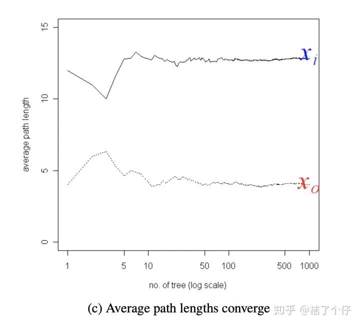 如果要把xi孤立出来,需要很11次划线,而x0需要的次数要少很多。所以x0比xi更可能是异常点。一棵树不够可信?没事,记得随机森林random forest不?没错,这里也引进一堆树。如果多数的树都在前几次分割时分出同一个点,那么这个点是异常点的概率就非常高了。