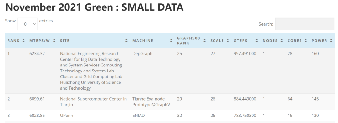 在Green Graph 500排名的Small Data任务表现上,DepGraph性能功耗比排名全球第一,达到每瓦6234.32MTEPS。