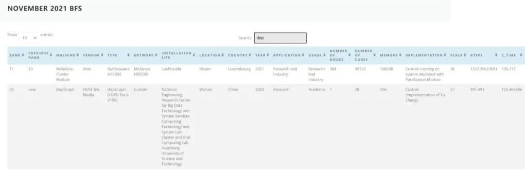 在Graph 500的两项排名中,DepGraph单机性能达到全球第一,在SSSP和BFS两个应用上分别达到884.361GTEPS和997.491GTEPS。(单机性能与总体性能不是一个概念)