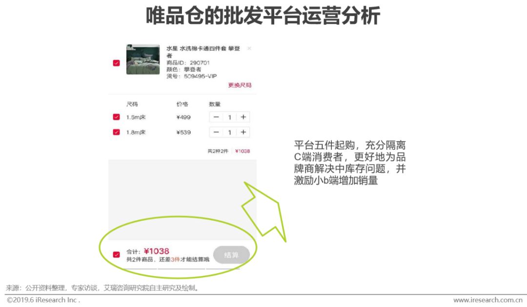 批发+零售模式:维品仓线上平台的目标客群稍有不同。唯品仓目标客户中,中小型批发商的占比很高,为了满足他们的进货需求,相比同类平台,库存深度中等,购物门槛也比一般的库存分销平台稍高一些,需要五件起购。