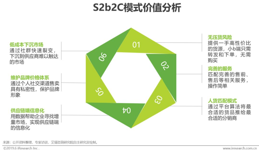 S2b2C模式的优势可分为两层来解读:表层是去中心化服务,表现为平台为小b提供货源与便捷服务,通过小b人群帮助C端消费者找到合适的商品,挖掘他们的潜在需求。深层是整个产业链效率的提高,表现为资源的整合和信息反哺,从而形成闭环,这也是S2b2C最有价值的商业逻辑。比如,C端的消费偏好通过b端反馈到S端实现供应链的信息化, 从而优化生产资源配置,又反之帮助小b端群体精准营销,提高转化率。