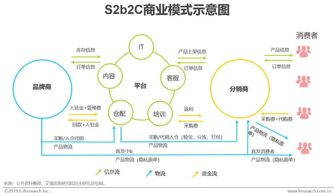 S2b2C模式是由S(供应商)、小b(分销商)和C(消费者)三方构建一张协同网络:这个过程中S和b紧密合作,一起服务于C端消费者。库存电商的S2b2C模式是指,上游品牌商的库存和订单的ERP系统与分销平台的交付系统链接,分销平台则服务于下游小b端分销商,为其提供可靠的货源,丰富的播货素材和完备的配套服务,最终分销商通过社群营销触达终端消费者。