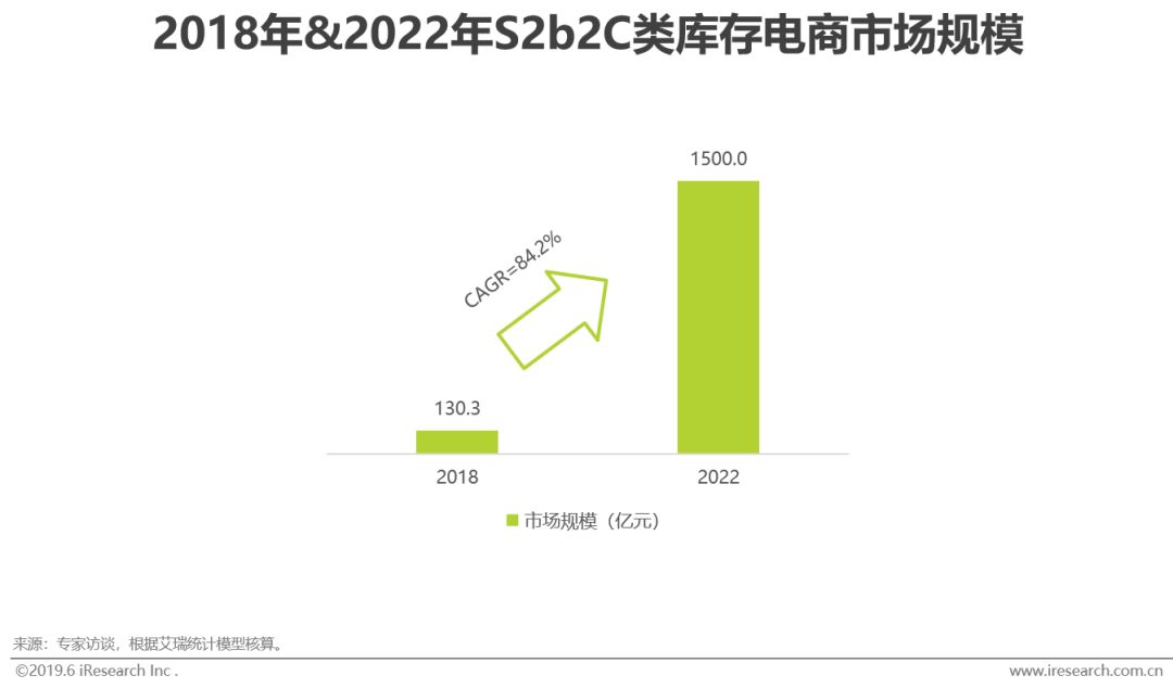 目前市场百亿级,增长迅速:艾瑞分析推算,目前整个库存电商行业2018年的市场规模约为205.3亿,其中S2b2C类库存分销平台的市场规模约为 130.3亿。艾瑞分析预测,预计2022年S2b2C类库存分销平台市场规模将达到1500亿,年复合增长率为84.2% 。