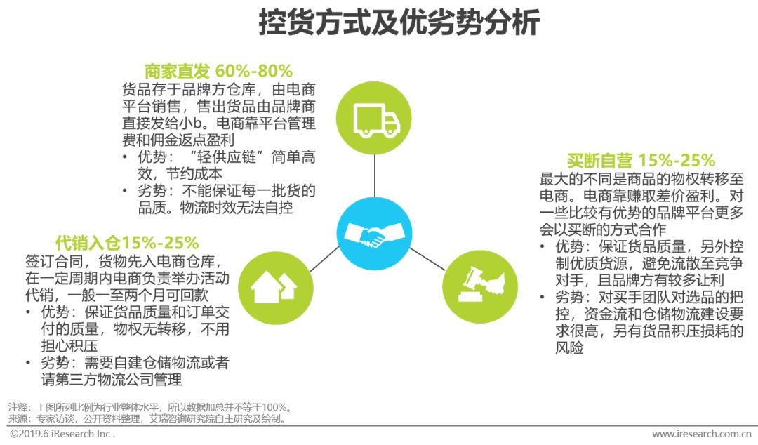 行业内供应链体系以商家直发和入仓为主,入仓指货物在售卖活动开始前进入平台仓库,入仓分为代销入仓和买断自营。三种获取方式中,商家直发的比例最高,代销入仓及买断自营的比例不足30%。其中在运营前期,大部分平台的商家直发比例能达到70%-100%左右,之后此比例随着对仓储物流投入的增加而缓慢下降,入仓的比例随之增长。