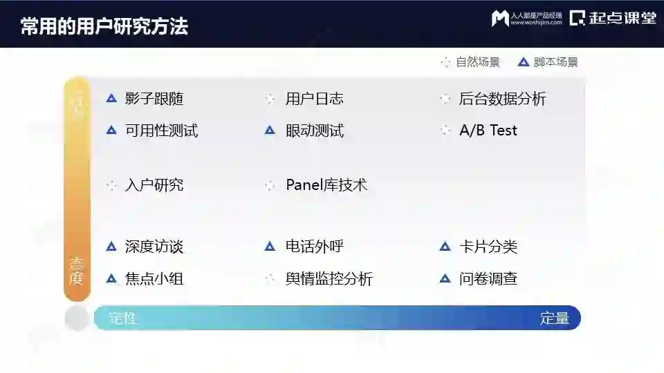 常用的研究方法分为定性和定量两个维度,主要研究用户的态度数据和行为数据。