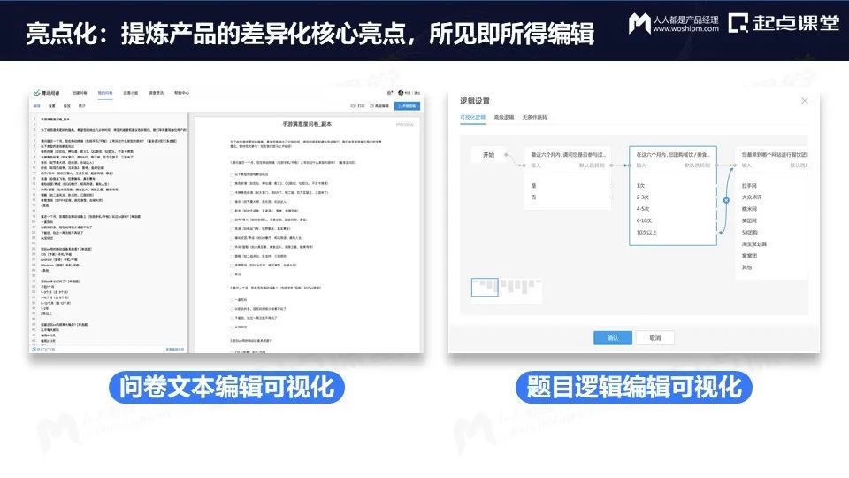 比如文本编辑可视化,可以直接通过文本编辑问卷,不需要在一个很复杂的编辑器里操作。还有逻辑设置,可以很清晰地以拖拽方式编辑,从而提高效率。