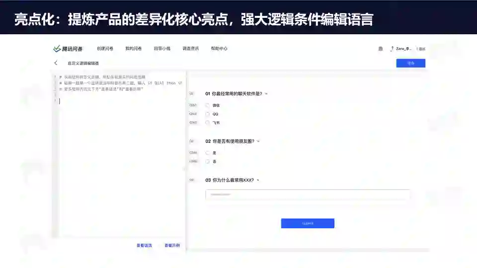 还有问卷的逻辑语言,在很多的研究项目里,刚开始可能简单的逻辑就能满足,但是到一些复杂的逻辑编辑的时候,就会出现问题,腾讯问卷最初的处理办法是定制,非常耗时,而且最后呈现的效果也不是很好,所以专门开发了DSL逻辑语言。