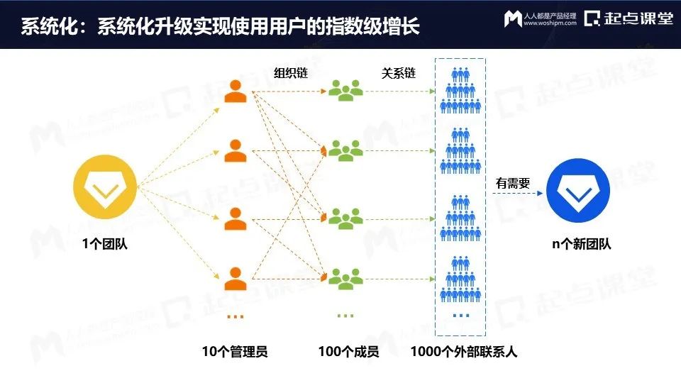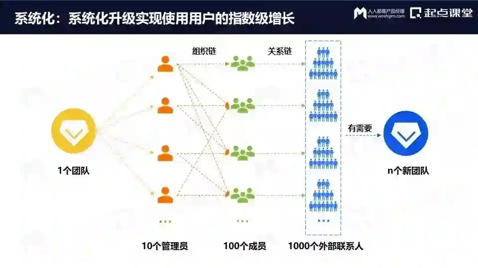 其中的逻辑是一个团队加入后,可能会有十个组或者十个管理员,这十个管理员通过各自的组织链,拉相应的成员进来,这些成员又会有相应的关系链,可以把外部联系人拉进来,这样整个系统使用的人群就会指数级地增长。