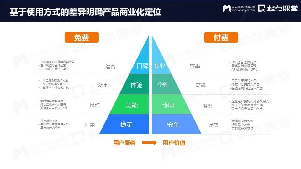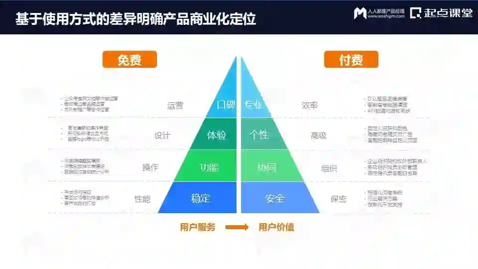 在免费的时候,更侧重用户服务和用户体验,讲功能、品牌认知和口碑。但是到付费的时候,用户更看重的还是价值。