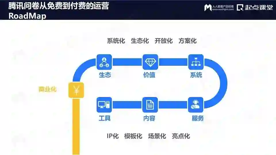 腾讯问卷从免费时代的运营到付费时代的运营总结为roadmap。最开始腾讯问卷只是一个工具,然后围绕工具做内容,给出卷人和答卷人做服务,围绕这个服务,在商业化阶段系统化的能力升级,为客户提供价值,搭建商务生态,实现商业化。