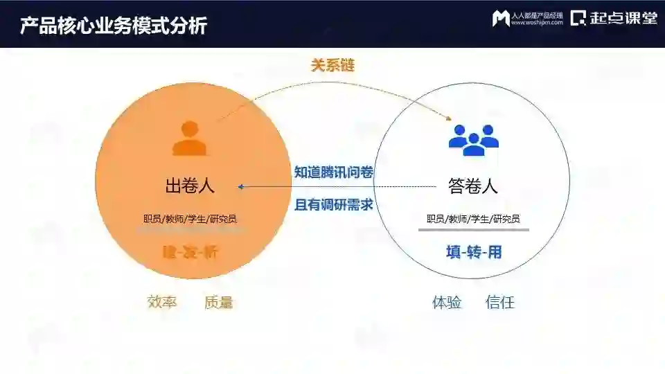 做运营产品就是基础,所以首先要理解产品的核心是什么。对于问卷而言,产品的核心就是两方:一方是编辑问卷的出卷人,一方是回答问卷的答卷人。