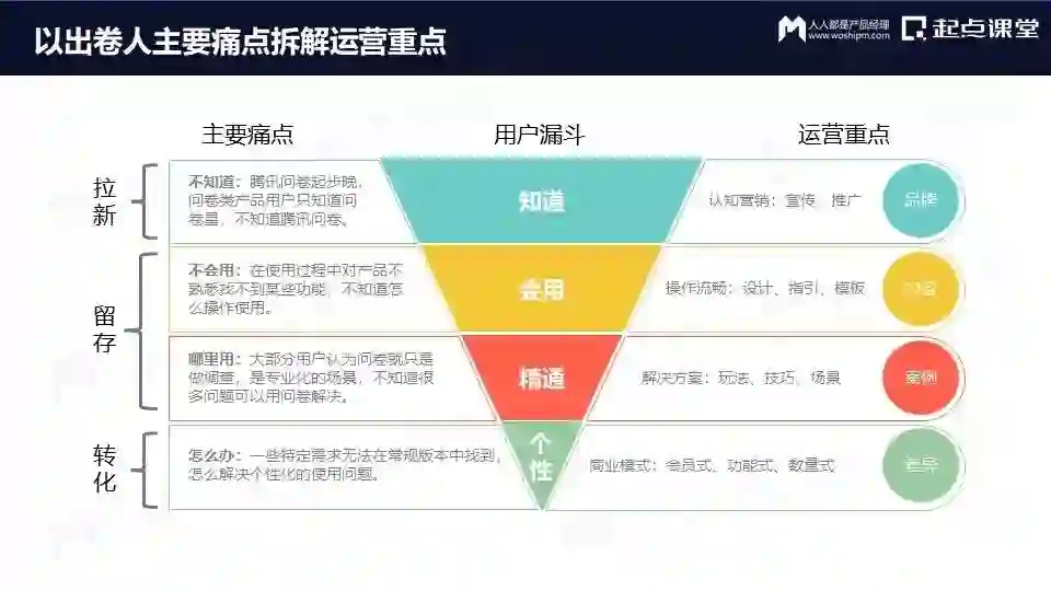 对出卷人的运营,着重做的是内容,而对答卷人的运营,着重是吸引拉新和活跃,这构成了腾讯问卷从0到1的整个运营过程。
