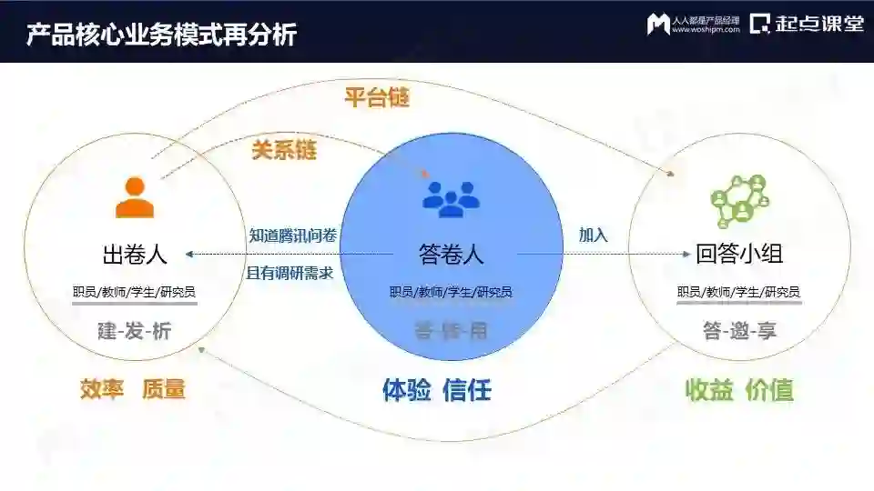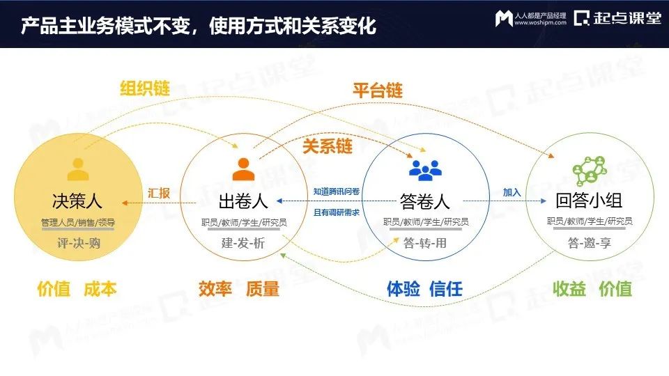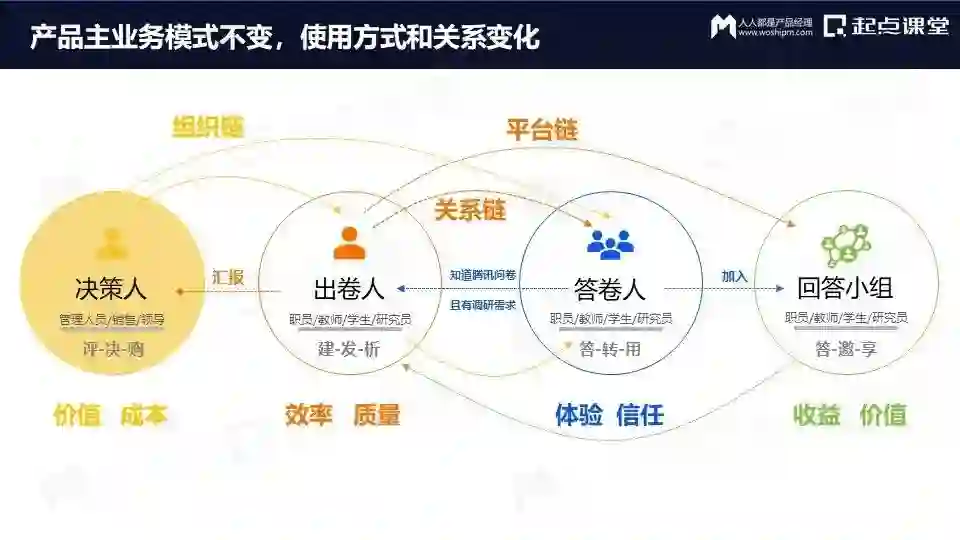 决策人是和整个组织链在一起的,问卷业务从最开始的关系链到平台提供服务,再到组织关系的组织链,产品的业务模式发生了变化。