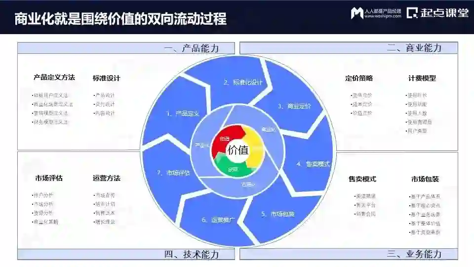 整个价值就是一个循环的过程,产品要做的就是产品化、商业化和市场化,围绕这个步骤,有对应的商业化七个步骤,在每个步骤里面,需要不同能力的输出: