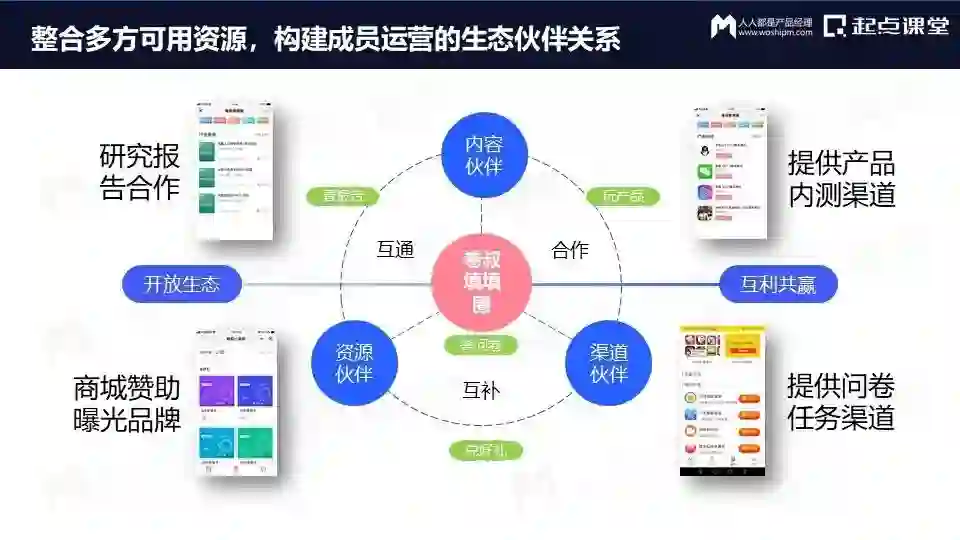 那这些资源怎么样去整合呢?问卷平台可能提供不了这么多资源,所以需要在内容伙伴、渠道伙伴和资源伙伴层面尽可能地争取到更多的资源,在卷叔填填圈平台上合作,提供一些任务、内测的渠道和商城礼品的赞助。