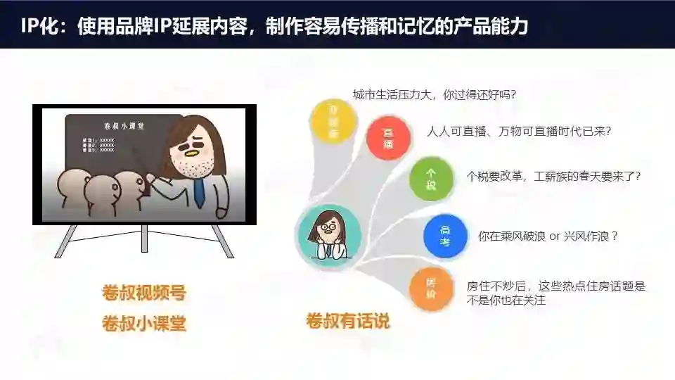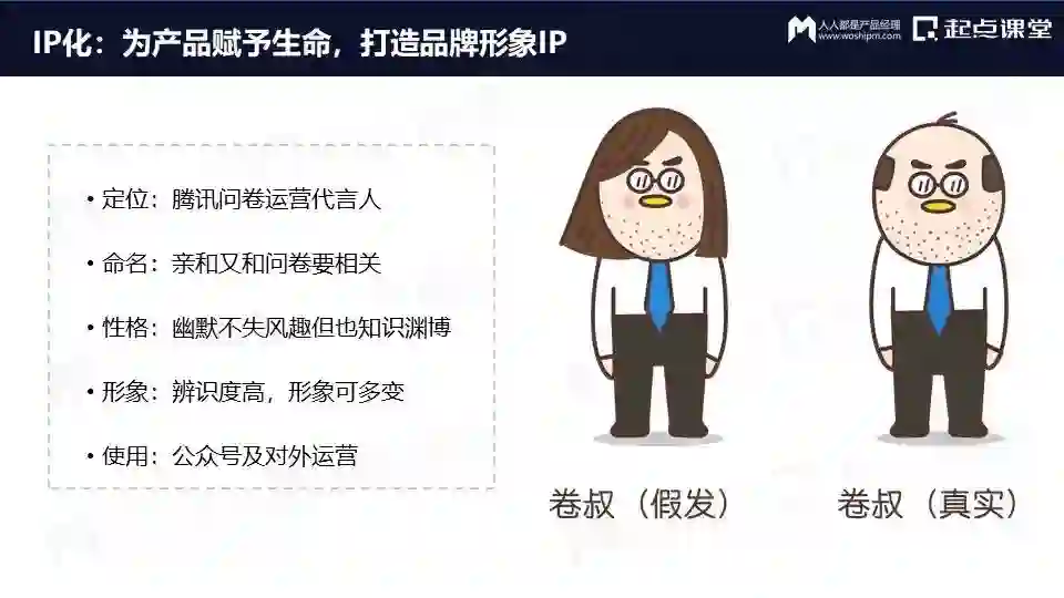IP内容定位一定要基于产品的特性,比如问卷是做调查的,可以用问卷发起一些热点调查引导用户使用,比如卷叔有话说栏目,会关注亚健康、直播、高考、房价等比较热点的话题,用户在参与的过程中对产品会有初步的了解。然后再以卷叔比较专业或者活泼的口吻去解读,形成有话题性的内容引起传播。