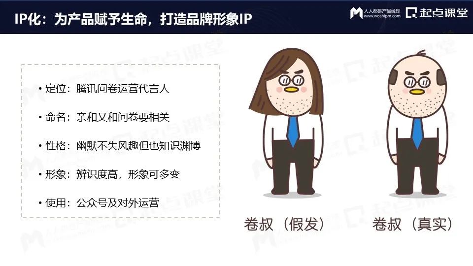 IP化就是给产品赋予生命,打造品牌形象。我们所在的腾讯用户研究与体验设计部(CDC)有专业的品牌设计团队,依托这个优势,给腾讯问卷打造了一个自己的IP“卷叔”,作为产品运营的代言人。