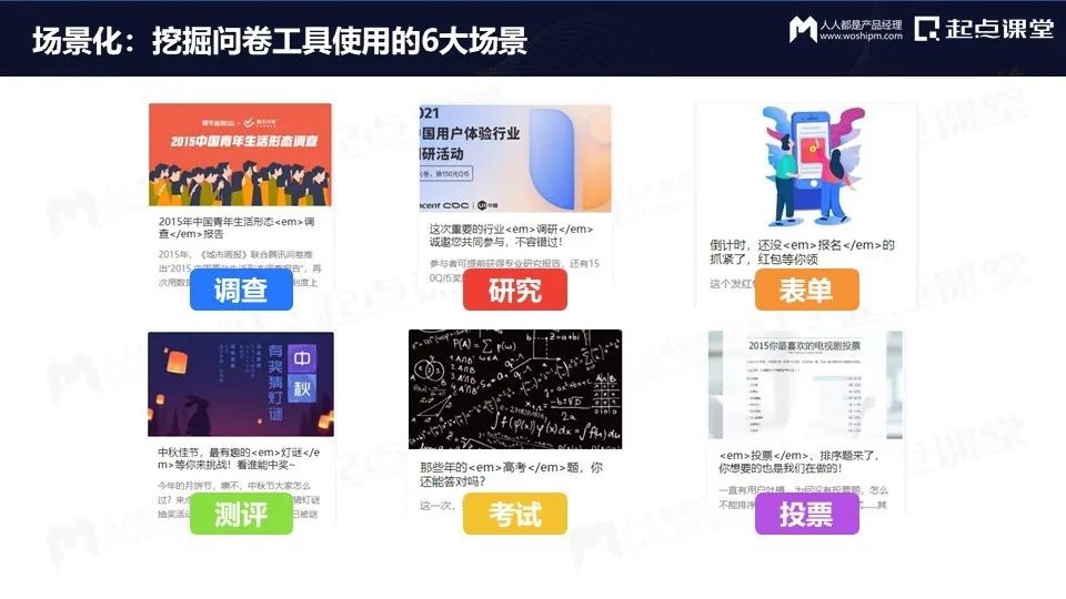 只告诉用户有这些使用场景还不够,自己也要不断地在这些场景中,输出具体的案例指导用户,比如生活形态的调查、用户体验行业的研究、报名活动、猜灯谜、最喜欢的节目投票、问卷形式的高考试卷体验等等。
