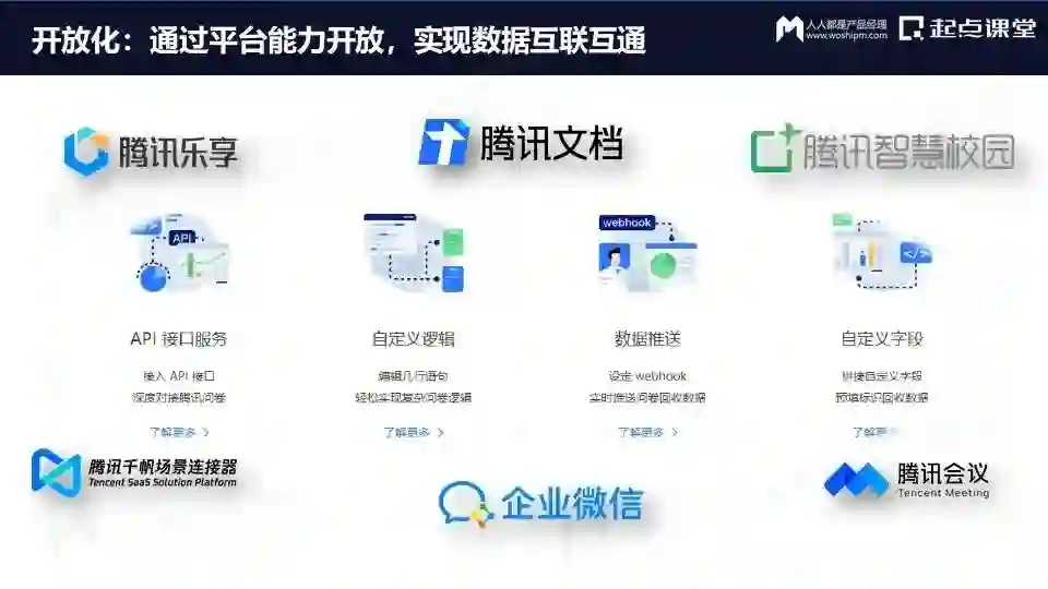 此外,问卷数据会和很多平台有合作需求,把产品能力集成,推进商业化的时候,产品已经不单单是一个工具了,要把工具的价值发挥出来,需要和更多的平台去合作,嵌入或集成就会产生更多的价值。