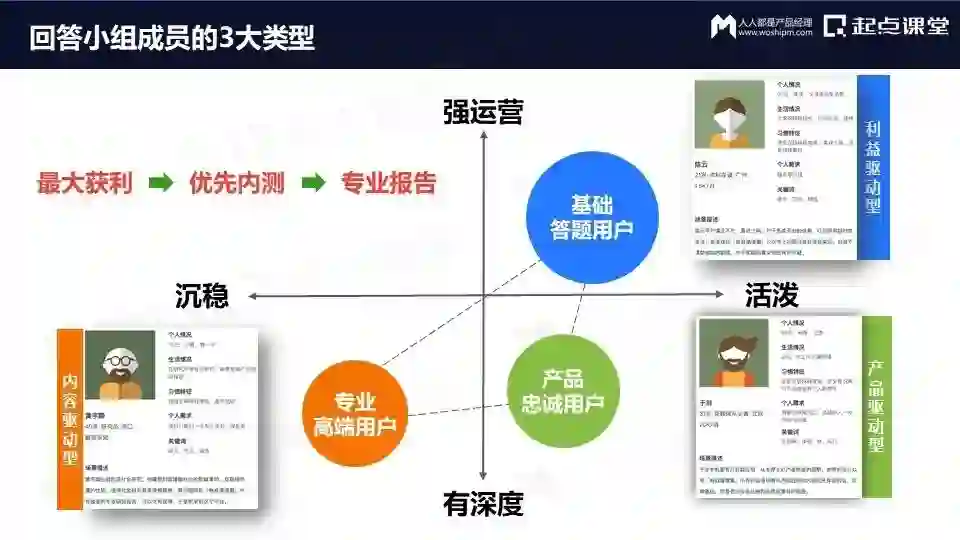 那怎么去运营这些答卷人呢?他们为什么会愿意留在平台上答卷呢?通过对这些用户做分析,可以将他们分为三类: