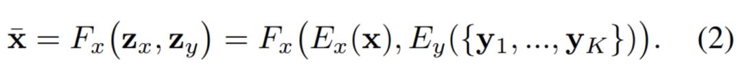 如果想要了解 FUNIT 的学习过程,那么了解它的目标函数及组成模块是最好不过了。如前所述,整个 FUNIT 框架主要包含 Few-shot 图像转换器和多任务对抗判别器。其中 Few-shot 图像转换器 G 又包含内容编码器 E_x、类别编码器 E_y 和解码器 F_x,通过这些模块,前面方程 (1) 就可以改写为: