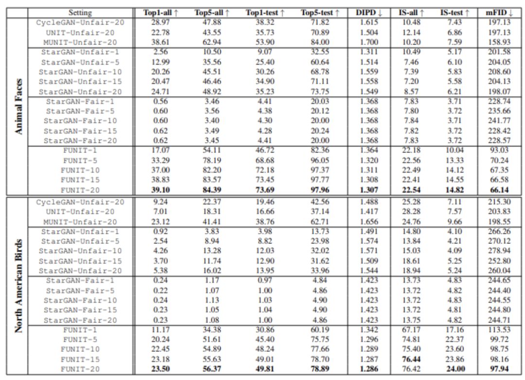 从表中还可以看出,FUNIT 模型的性能与测试时可用目标图像 K 的数量呈正相关。