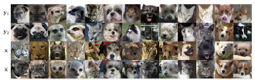 如上所示,其中 y_1 和 y_2 是测试阶段可用的目标类 few-shot 样本图像、x 是源类输入图像,而 x bar 就是源类到目标类的转换结果了。我们可以看出来,x 和 x bar 之间的「神态」都非常相似。