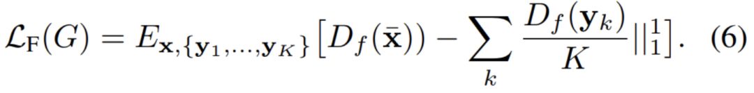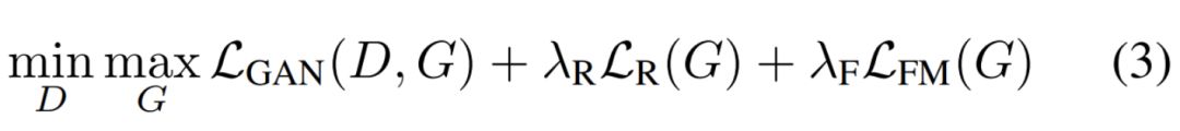 其中 L_GAN、L_R 和 L_F 分别是 GAN 的损失函数、图像内容重构损失和特征匹配损失,它们共同构建了整个模型的目标函数。下面简要地展示了这三种损失函数的计算公式,当然在原论文中,这三个损失函数都有详细的解释,读者可参考原论文理解。