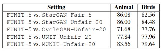 结果表明,无论是与「公平」还是「不公平」的基线相比,受试者都认为 FUNIT-5 生成的结果更加可信。