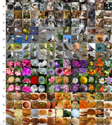该结果利用 FUNIT-5 模型计算得到的。从上到下依次是动物面部、鸟、花和食物数据集得到的结果。研究者为每个数据集训练一个模型。y_1、y_2 是 5 个随机采样类别图像中的两个,x 是输入内容图像,x¯表示转换输出。结果显示,尽管在训练过程中没有见过任何来自目标类的图像,但 FUNIT 能够在困难的 few-shot 设置下生成可信的转换输出。从图中可以看出,输出图像中的对象与输入中的对象姿态类似。
