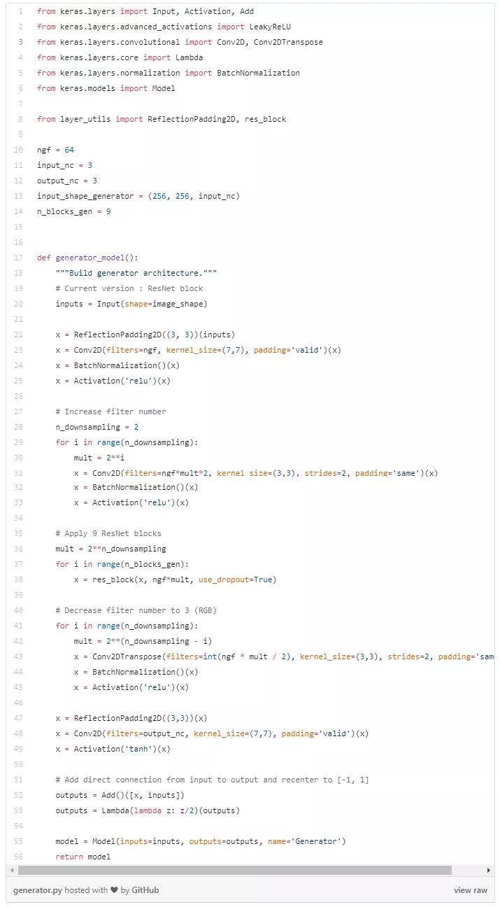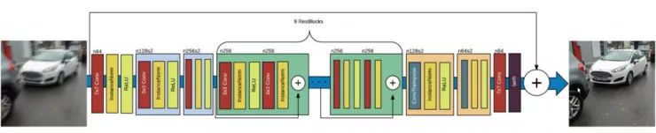 核心是采用9个ResNet blocks对原始图像进行上采样。来看一下Keras上的实现!