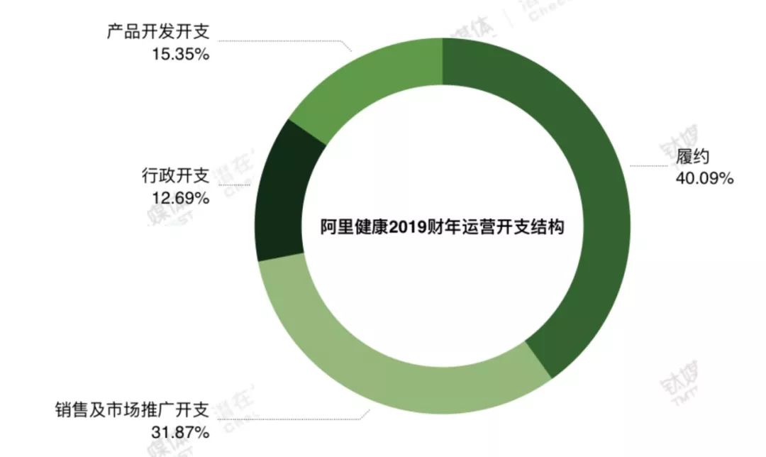 在自营业务收入增长的同时,该业务所产生的仓储、物流及客服支出等“履约费用”也在增长,报告期支出人民币5.72亿元,较去年3.39亿元增加了68.9%,也成为阿里健康2019财年占比最大的开支,占总支出总额的40.09%。