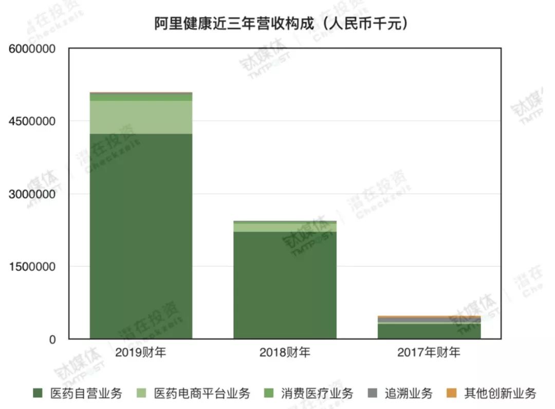 阿里健康近三年营收构成,数据来源:阿里健康2017财报、2018财报、2019财报(制图/钛媒体App)