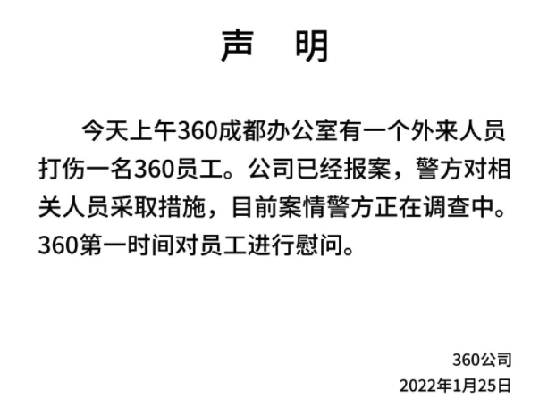 1月25日,@360公司 微博发布声明称,今天上午360成都办公室有一个外来人员打伤一名360员工。公司已经报案,警方对相关人员采取措施,目前案情警方正在调查中。360第一时间对员工进行慰问。早些时候,@360公司 微博发布回应称,一切案情相关以警方通报为准。360谴责一切恶意伤人行为,并即刻配合警方和医院对受伤员工展开救治和慰问。