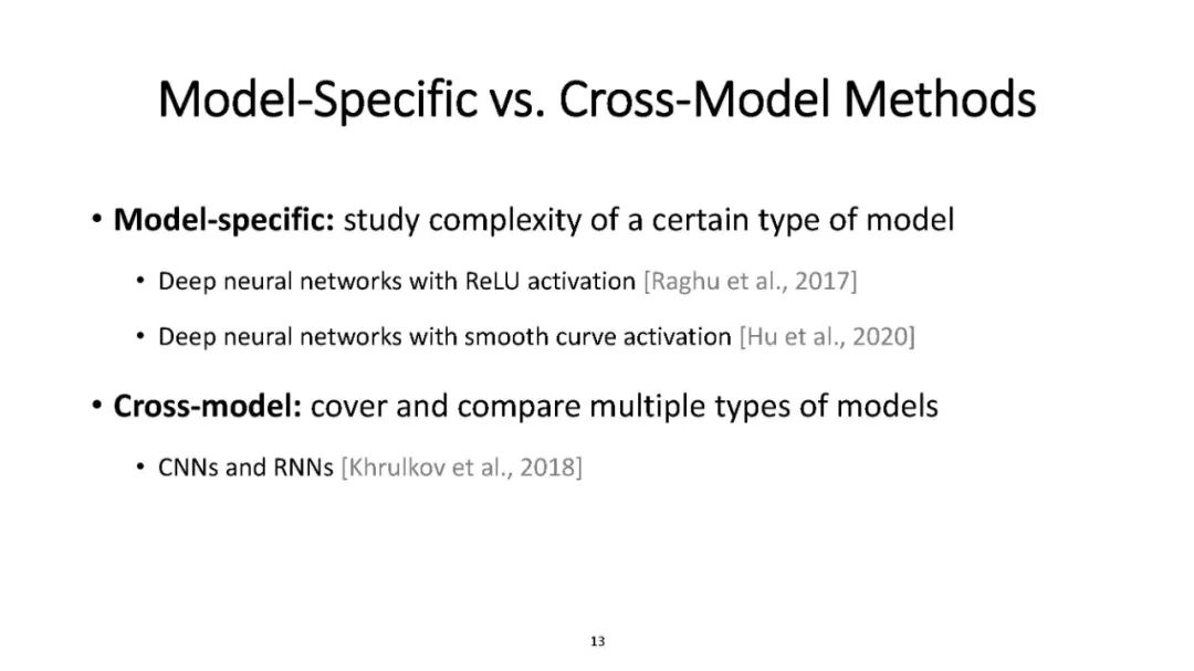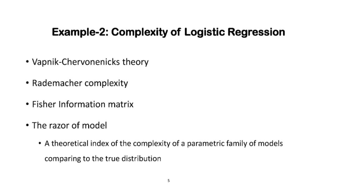 对机器学习模型复杂性的研究可以追溯到几十年前。20世纪90年代的一系列早期研究讨论了经典机器学习模型的复杂性[16,20,21,98]。其中具有代表性的模型是决策树[19],其复杂性总是通过树的深度[20]和叶节点数量[16]来度量的。模型复杂性分析的另一个常见课题是逻辑回归,它是大量参数化模型的基础。从Vapnik-Chervonenicks理论[26,96]、Rademacher复杂性[46]、Fisher信息矩阵[21]和[6]模型的razor等角度研究logistic回归模型的复杂性。在这里,模型剃刀是一个理论指标,比较一个参数模型家族的真实分布的复杂性。然而,深度学习模型与几十年前讨论的经典机器学习模型有很大的不同[70]。经典机器学习模型的复杂性分析不能直接应用或直接推广到深度模型。
