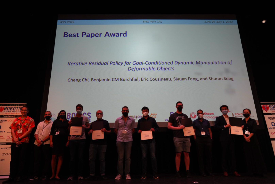 获得本届最佳论文奖的研究是《Iterative Residual Policy for Goal-Conditioned Dynamic Manipulation of Deformable Objects》。