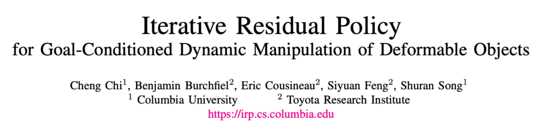 该论文研究了可变形物体的目标条件动态操作问题。基于其复杂的动力学 (物体变形和高速动作) 和严格的任务要求(精确的目标规范),这项任务非常具有挑战性。为了应对这些挑战,研究者提出了迭代剩余策略(IRP) ,这是一个适用于具有复杂动力学的可重复任务的通用学习框架。