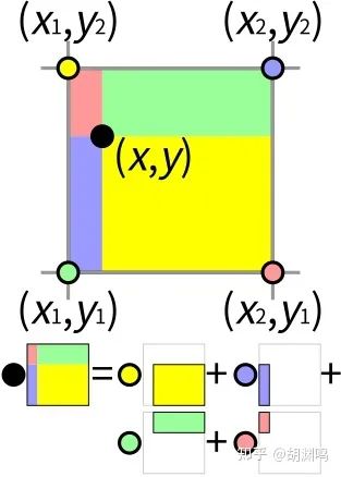 构成一个单位正方形, 四个小矩形的面积之和是 1 , 每个像素对应的权重系数是与它颜色相同的矩 形的面积。比如当 越靠近左上角黄色的点 时, 右下方黄色矩形的面积就会越大, 从而 像素获得的权重也就越大。