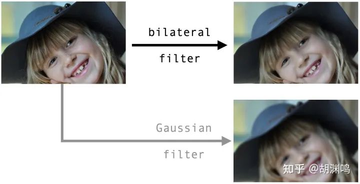 可以看到,双边滤波器可以在保持图片中锐利边缘的同时,抹去局部细节,起到磨皮效果。我还放了一张相同半径的高斯滤波器对比,可以看到高斯模糊会模糊边缘,效果是无法接受的。(输入图片来源:Pixarbay)