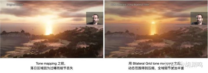 色调映射(Tone mapping)是解决这个问题的良药。Tone mapping 有两种,一种是对屏幕上所有的像素用同一个函数调整亮度,即 Global tone mapping;另一种则会根据每个像素周围的像素智能地根据上下文 (context) 进行调整亮度,即 Local tone mapping,往往更为有效。