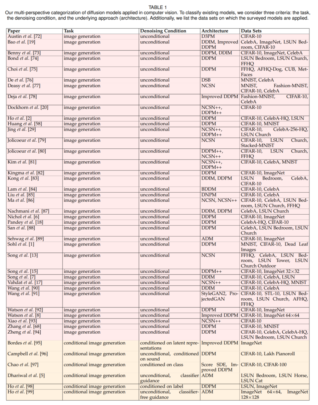 研究者考虑到不同的分类标准,将扩散模型归入一个多角度的分类法。也许区分模型的最重要标准是由(i)它们所应用的任务和(ii)它们所需要的输入信号来定义的。此外,由于在制定扩散模型时有多种方法,(iii) 基础架构是对扩散模型进行分类的另一个关键因素。最后,训练和评估过程中使用的数据集也非常重要,因为这有助于在同一任务上比较不同的 baseline。研究者根据前面列举的标准对扩散模型进行了分类,见表 1。