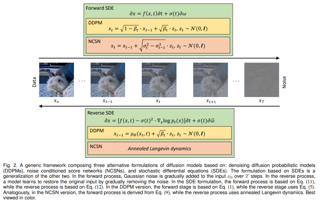 扩散模型是一类概率生成模型,它可以学习逆转一个通过添加不同尺度的噪声来逐渐降低训练数据结构的过程。在第二章的 3 个小节中,本文介绍了扩散模型的三种表述,即去噪扩散概率模型、噪声条件下的得分网络,以及基于随机微分方程的方法,该方法是对前两种方法的概括。对于每一种表述,作者都描述了向数据添加噪声的过程、学习逆转这一过程的方法、以及在推理时如何产生新的样本。在图 2 中,所有这三种提法都被作为一个通用框架来说明。本文在最后一个小节中专门讨论了与其他深度生成模型的联系。