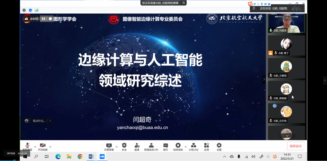 首先,由专委会主任张弘教授致开幕词,简单介绍了边缘人工智能在学术界及工业界相关应用的工作。接下来由演讲嘉宾闫超奇博士汇报《边缘计算与人工智能领域研究综述》,他以一个生动的“章鱼逃脱”案例引入边缘计算的概念,进而循序渐进地过渡到边缘计算与人工智能的基本概念和基础知识,介绍该领域研究的发展历史、分析该领域的发展趋势,探讨现今研究热点问题,并辅以具体案例介绍边缘人工智能在生产、生活、航空航天领域的应用。汇报结束后,引起了线上学生的热烈的反应,学生热情高涨,积极讨论,针对边缘人工智能的具体学术问题以及工程应用部署问题进行了咨询。演讲嘉宾李旭亮老师,万家旭博士,郭威威、沈天琦等从事一线研究工作的嘉宾也针对不同的问题进行仔细的解答,逐一交流等等。