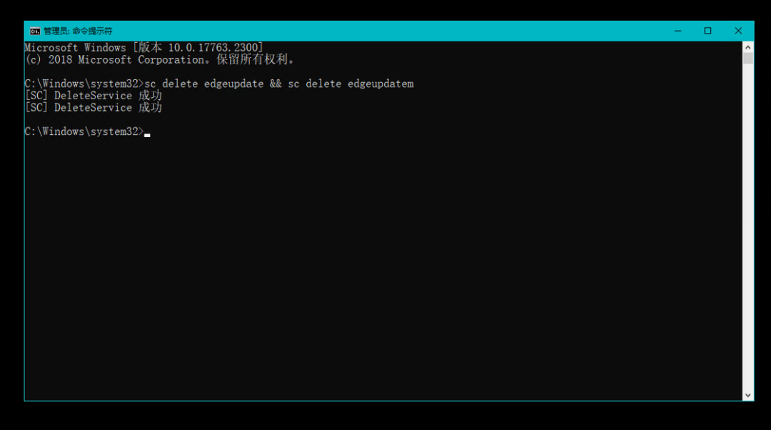 然后,我们需要删除两个执行 Edge 后台更新程序的系统服务。使用管理员权限打开命令提示符(搜索 CMD 可得),输入sc delete edgeupdate && sc delete edgeupdatem 以完全删除 Edge 更新服务。
