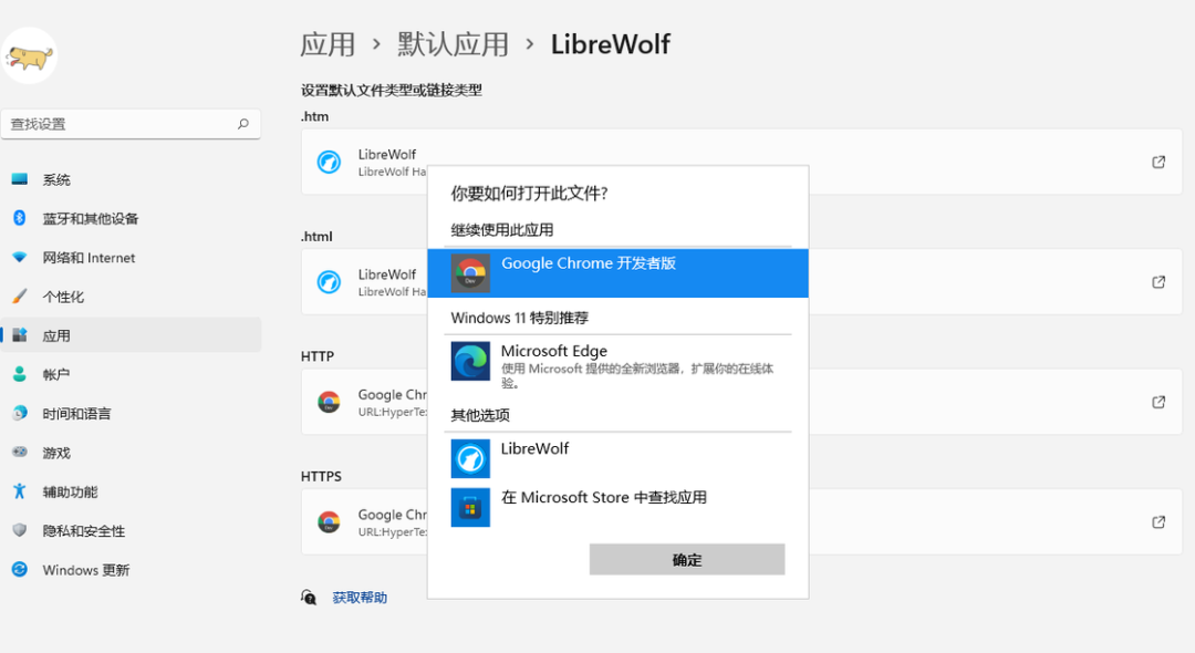 现版本如果想要切换某浏览器为默认,需要更多的步骤。假设我们想要将 Liberwolf 设定为默认浏览器,需打开设置面板,进入「应用 > 默认应用 > Liberwolf」,将 .html、.htm、HTTP 和 HTTPS 四个条目设置为 Liberwolf。