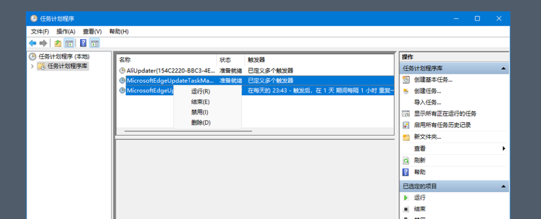 使用 Windows 搜索打开任务计划程序,点击左侧的任务计划程序库,选中以 MicrosoftEdge 开头的任务,点击禁用。